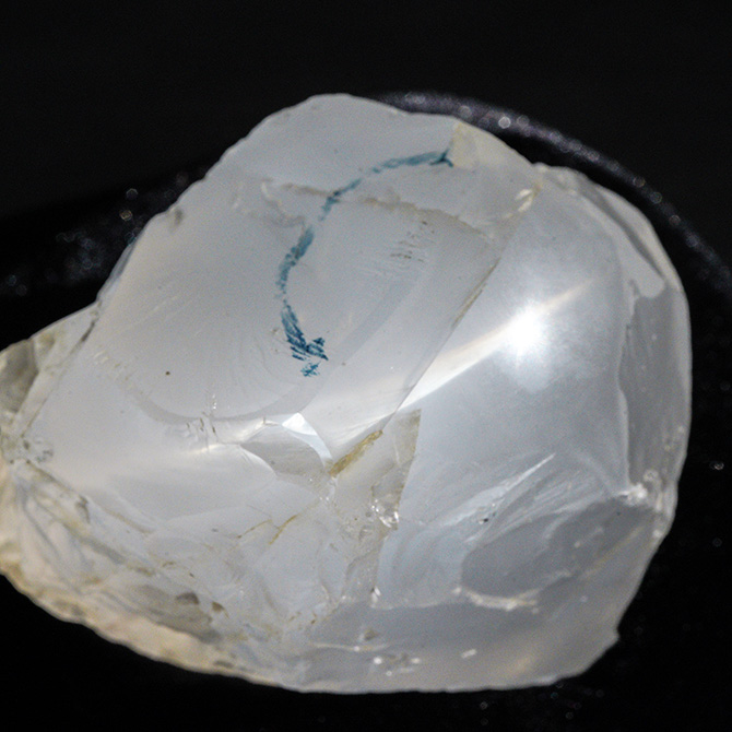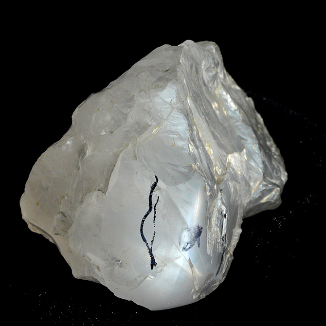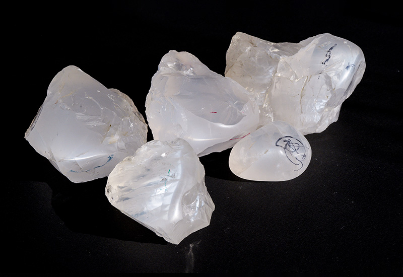 お話を聞くと、メタモルフォーシスを研磨する際に「このあたりにスターの出る軸が通っている」と目星をつけた跡なのだそうです。このあと、これらの原石はこのあと磨かれてロッドやルースになっていきます。