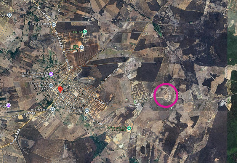 鉱山はここ(下のピンクの◯)と思われます。赤いGoogleマップのポイントがコルデイロスの街ですね。