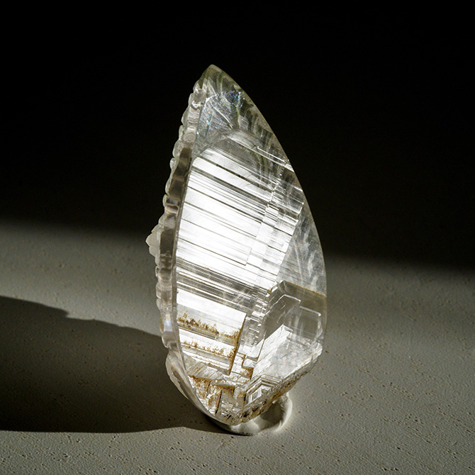 裏面は原石の面そのままで、斜めに走る結晶のラインがとても美しい一品です。表から見るとすりガラス状態ですが、裏面はピカピカのクリアです。