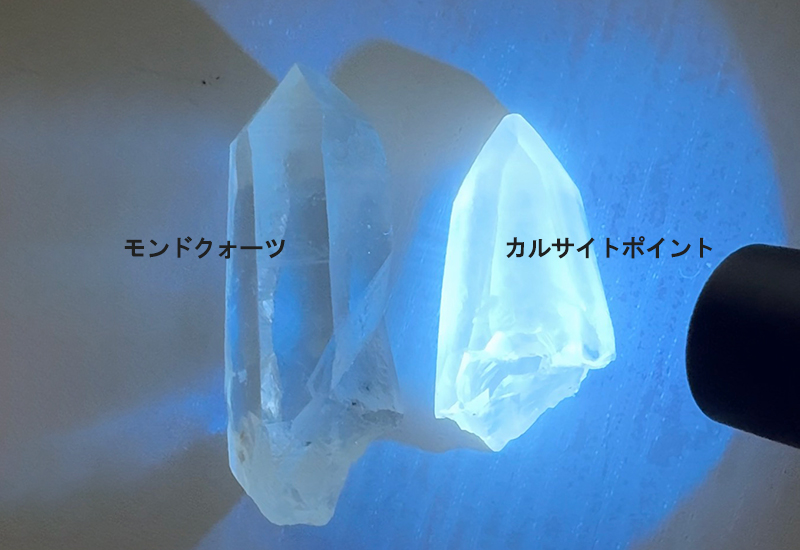 そしてUVライトで白色蛍光します。表面のマット感のせいなのかと似たような表面の水晶ポイントと並べてUVライトを当ててみましたがやっぱりカルサイトだけ眩しく蛍光しました。