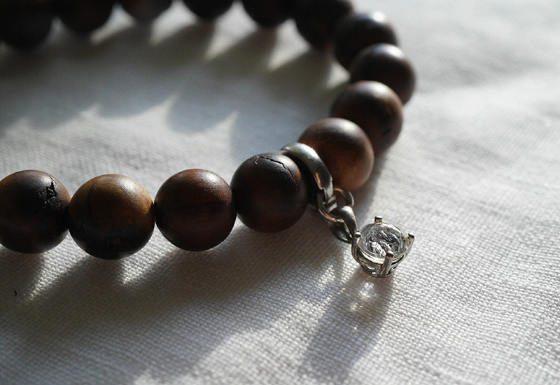 かなり贅沢な着け方だとは思いますが、バイア産のペンダントトップは雷打棗のブレスにつけています。手元にあるので石もよく見え、この組合せが外せなくなっています。赤く濃い色、ツヤと割れの具合がとても風情がある(骨董品を思い出します)雷打棗に、カットされた水晶の輝きがとても合います。雷打棗でなくても、少し固め、密度が高めの木なら似合うんじゃないかと思いますね。黒檀、白檀もいいと思います。