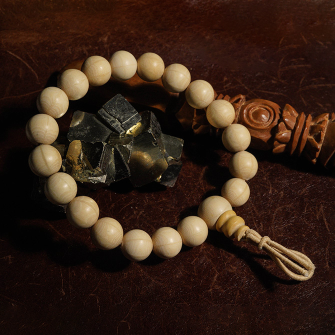 今回は同じく降龍木で作られた親玉を見つけたので、主玉が10mmの念珠型ブレスを2本つくりました。ボサはちょっと木質が違うように感じますが不明です。個人的にはツゲっぽい木質だなと感じています。