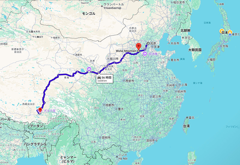 中国の四大仏教名山のトップであり、文殊菩薩の道場とされる中国で唯一仏教とチベット仏教が共存している場所です。とはいえチベットからは遠く北に離れた場所にあります。北京から南西に350キロ、車で4時間半で五台山です。そこからまた同じ方向に3500キロ・55時間くらい車で走り続ければチベットへ、という距離感です(実際はそんなルートは取らないでしょうけれど)。