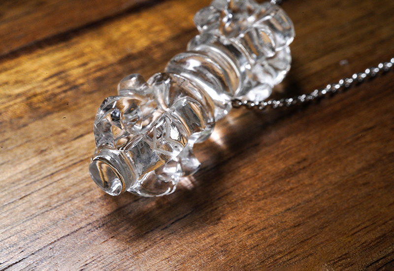 カイラス水晶で作られたヴァジュラの大きさは39mm×15mm、Silver925チェーンの長さは60cmです。水晶大珠と同じく、ヴァジュラに通す際にマルカンを新しくしていますが、ロウ付けでの閉じは行っておりません。